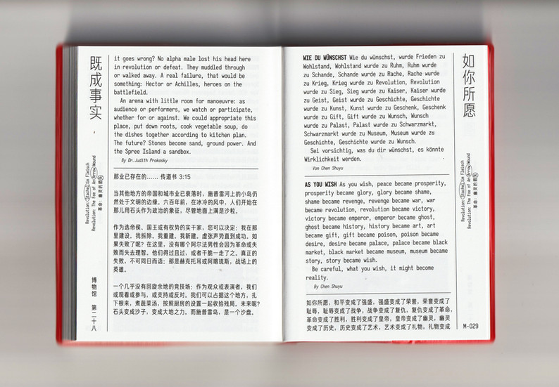 Paper Tiger is a Chinese independent theatre collective that focuses on cross-cultural practice. As an architect and curator, I have maintained a loose but sustained collaboration with them for the last fifteen years. Revolution: The Foe of An Arrow Wound is my first full engagement as one of the core team members. After going through the entire process of research and production, I found it fruitful to reflect on my embodied practice at the intersection of curatorial experiments in contemporary art and post-dramatic theater, pondering on how 'exhibition' and 'performance' can inspire each other and break through boundaries together.